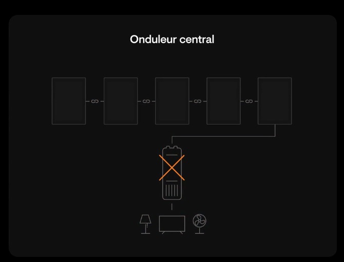 Avec un onduleur central, toute l’installation repose sur un seul point de défaillance. Si cet onduleur tombe en panne ou si un panneau rencontre un problème, c’est l’ensemble du système qui cesse de produire de l’énergie.